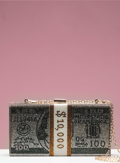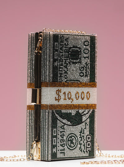 “Money Money Money!” That’s what you’ll exclaim when you see this extraordinary clutch. Shaped like a stack of $10,000 bills, it’s adorned with shimmering rhinestones for a glamorous touch. This clutch is not just a fashion statement; it’s a symbol of opulence and ambition.